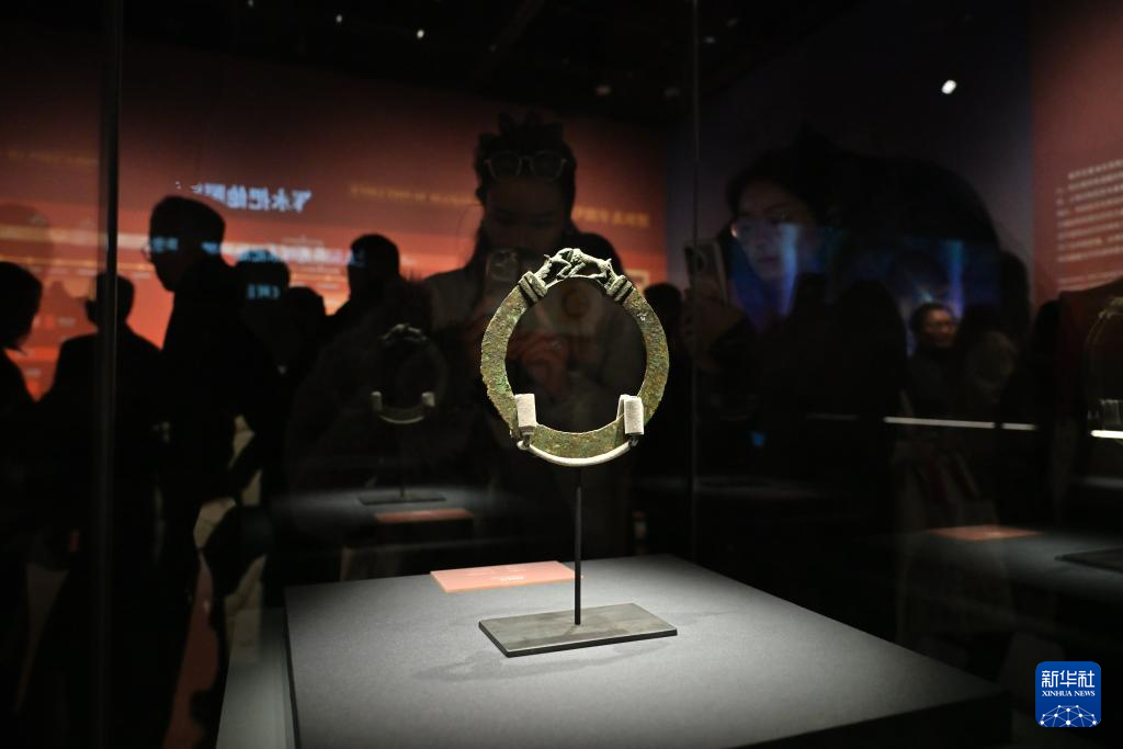 1月25日,观众在展览现场拍摄文物授权环。