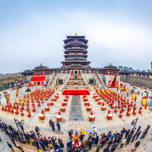 当日,江苏省宿迁市泗洪县组织12支锣鼓队150名鼓手在古徐城景区为市民和游客献上一场文化盛宴,人们在百鼓齐鸣中感受浓浓年味。