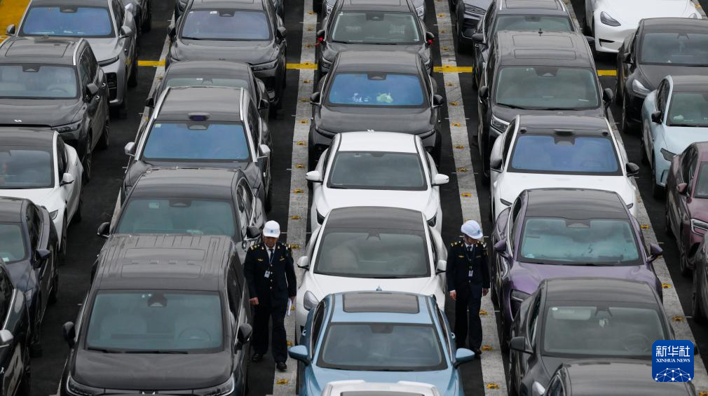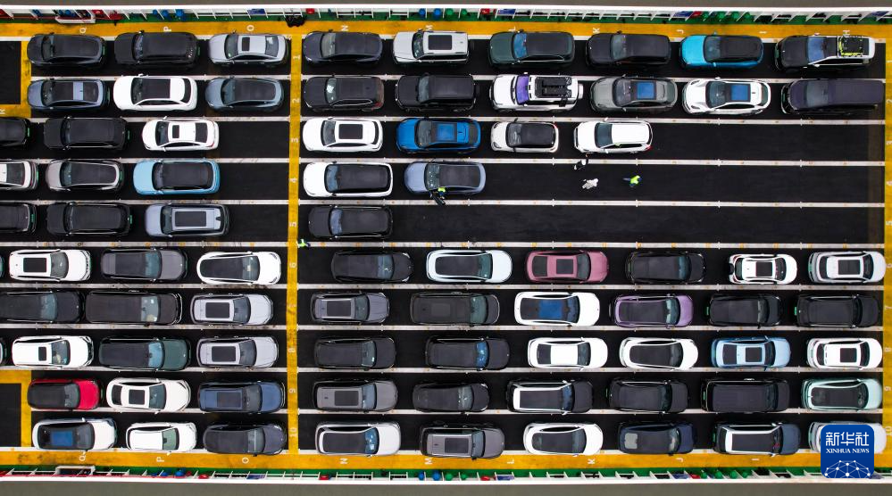 在海南省海口市新海港,新能源车辆在客滚船内有序停放(1月27日摄)。
