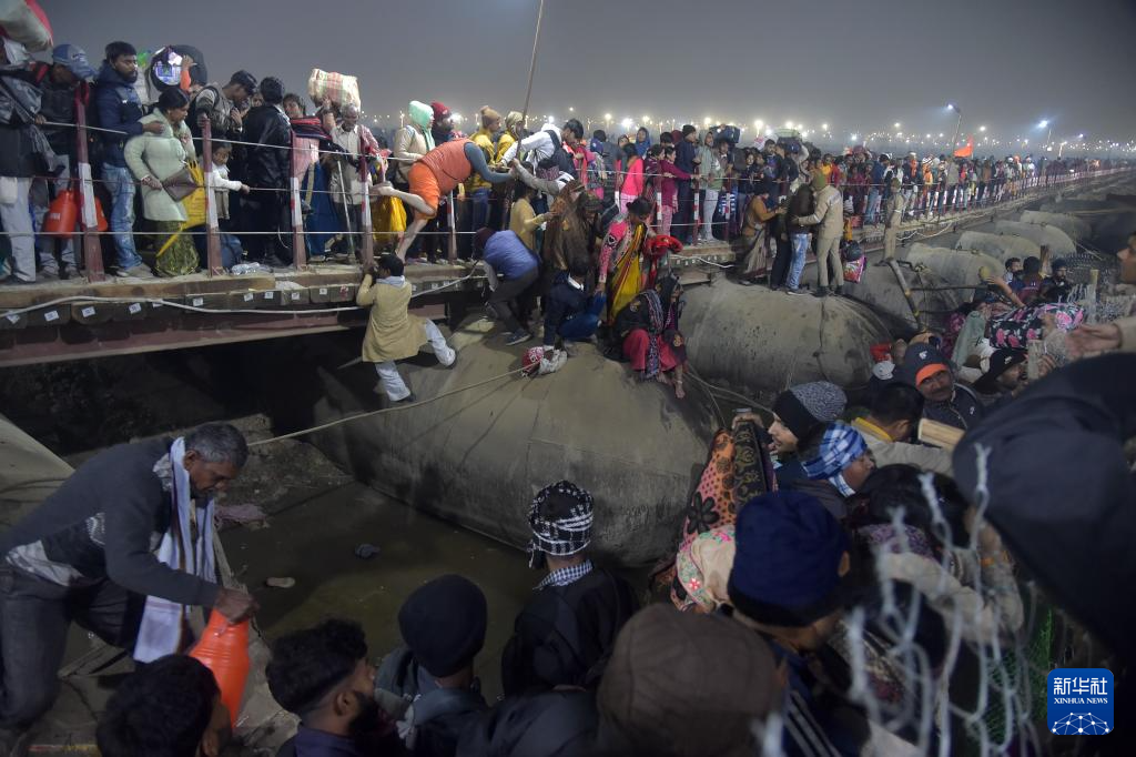 1月29日,在印度北方邦普拉亚格拉杰市,人们在踩踏事件发生后聚集在一座桥上。
