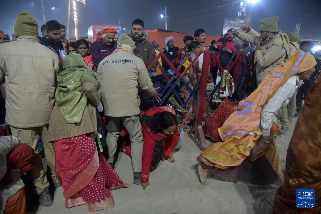 1月29日,在印度北方邦普拉亚格拉杰市,警察在踩踏事件发生后疏散人群。