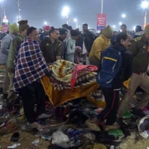 1月29日,在印度北方邦普拉亚格拉杰市,人们搬运踩踏事件中的伤员。