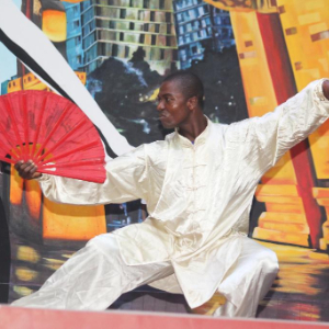 1月25日,在贝宁科托努的贝宁中国文化中心,一名武术爱好者在春节联欢晚会上表演。