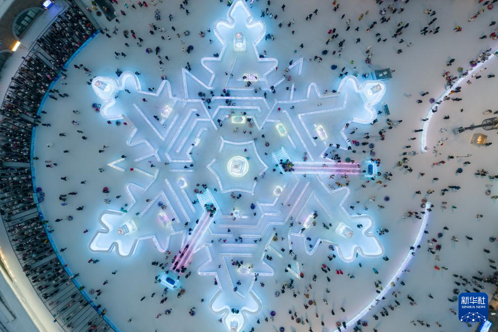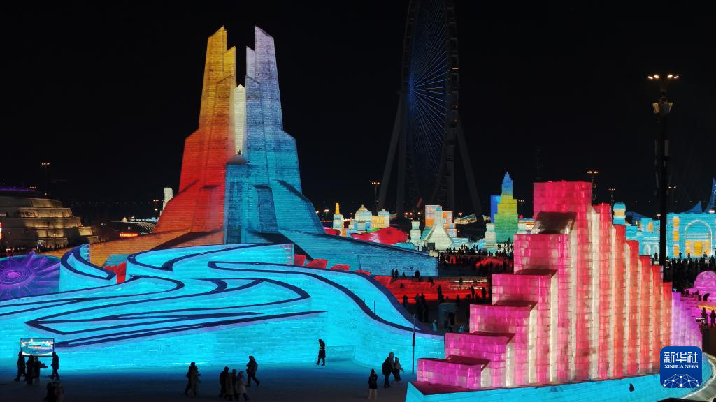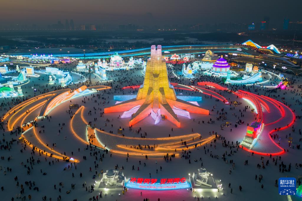 这是哈尔滨冰雪大世界园区内的主塔“亚洲同心”与第九届亚冬会会徽冰建景观(无人机照片,1月5日摄)。