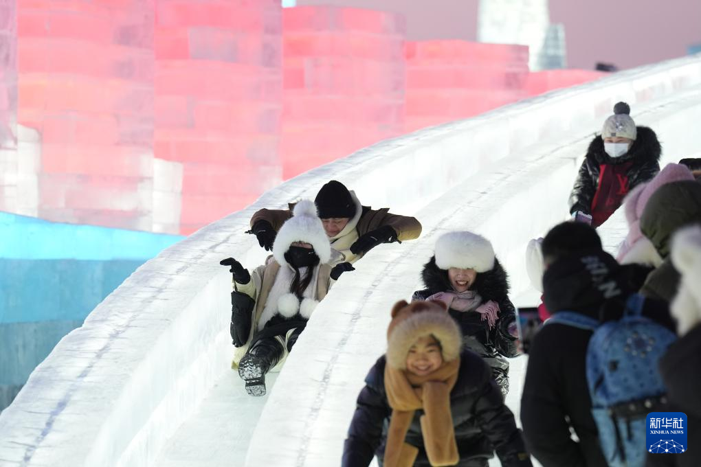 1月5日,游客在哈尔滨冰雪大世界园区内体验冰滑梯项目。