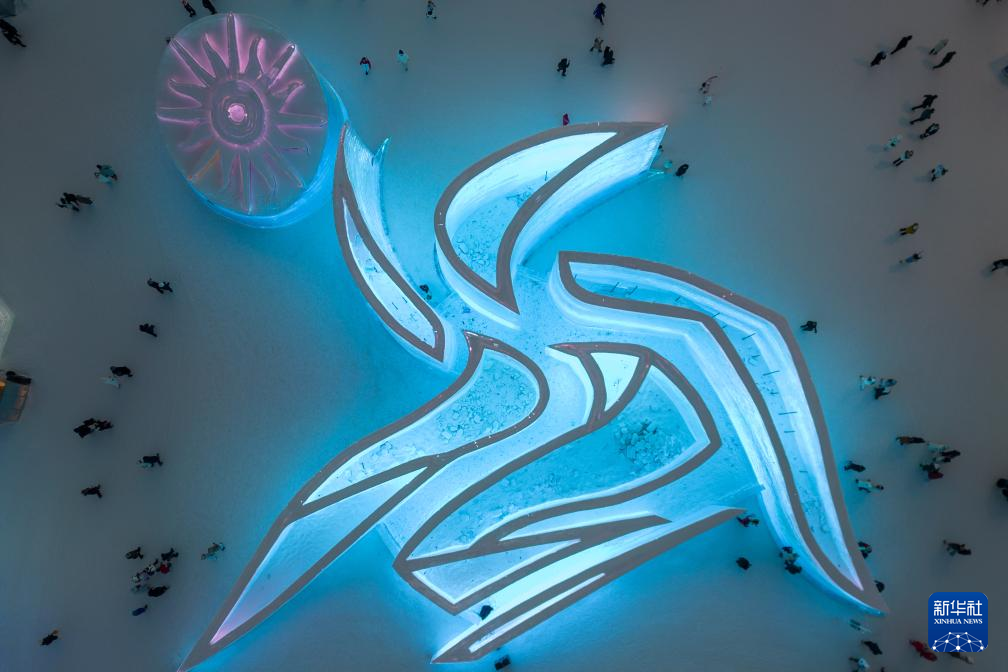 这是哈尔滨冰雪大世界园区内的第九届亚冬会会徽冰建景观(无人机照片,1月23日摄)。