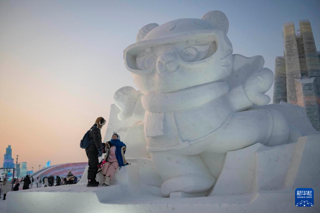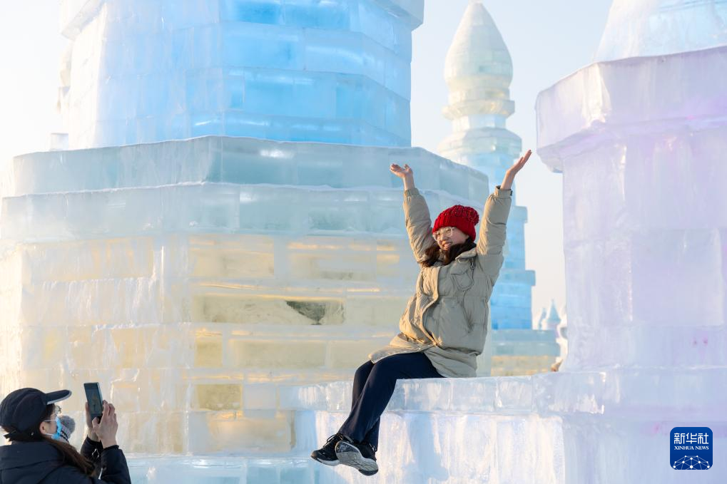 1月23日,游客在哈尔滨冰雪大世界园区内拍照留念。