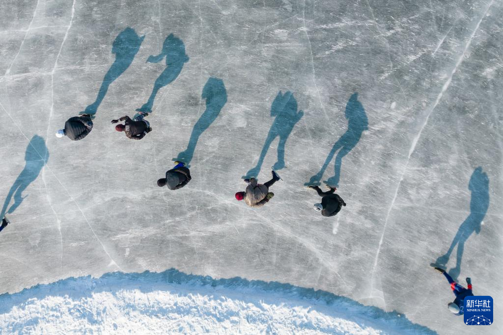 1月18日,人们在哈尔滨丁香公园内滑冰(无人机照片)。