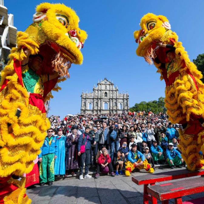 大年初二,澳门旅游局在大三巴牌坊前举办舞龙舞狮等贺岁活动,吸引大批市民及游客驻足观赏。