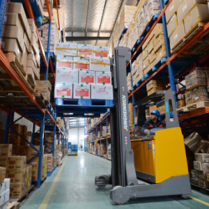 1月30日,在山东省青岛市城阳区夏庄街道青岛鲜美鲜到供应链管理有限公司云仓内,工人在驾驶叉车搬运、存储货物。