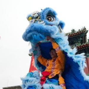2月1日,在北京民俗博物馆举行的北京东岳庙庙会上,来自重庆的舞狮队伍在表演。