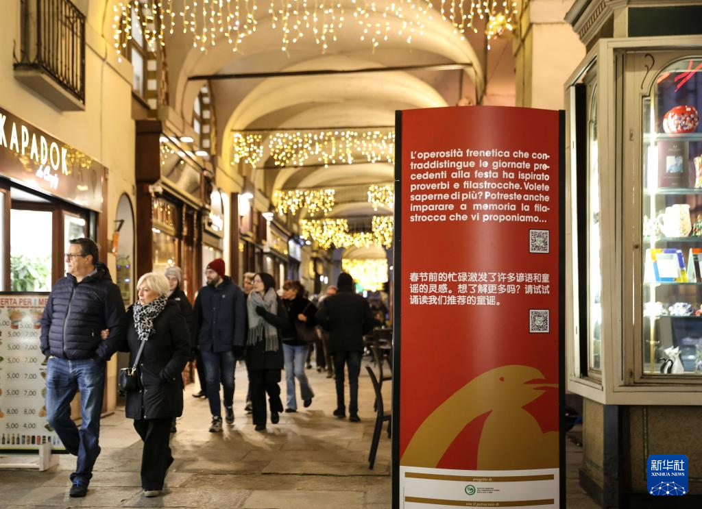 为庆祝中国蛇年春节,从大年初一开始,意大利都灵市中心商业街拱廊和商户摆放、张贴春节主题展板海报,向市民游客介绍中国春节的来历和习俗。同时,都灵著名历史建筑夫人宫每晚被春联灯光点亮,吸引市民游客驻足观看。