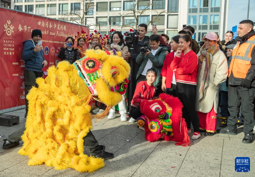 1月31日,在德国法兰克福市中心卫戍广场,舞狮演员与观众互动。