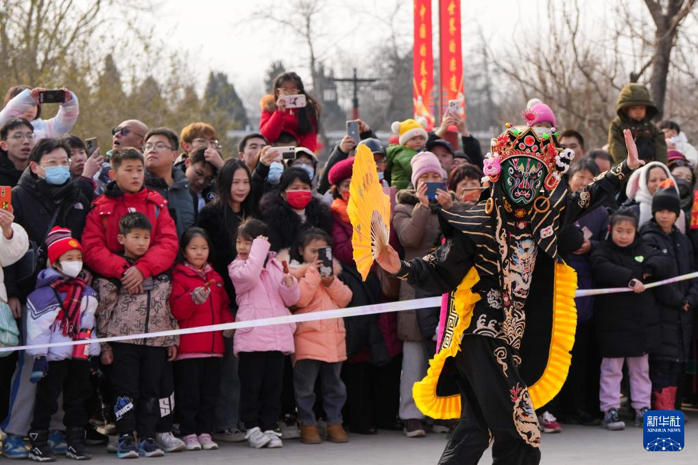 1月31日,游客在景山公园的万春嘉年华上观看川剧变脸表演。