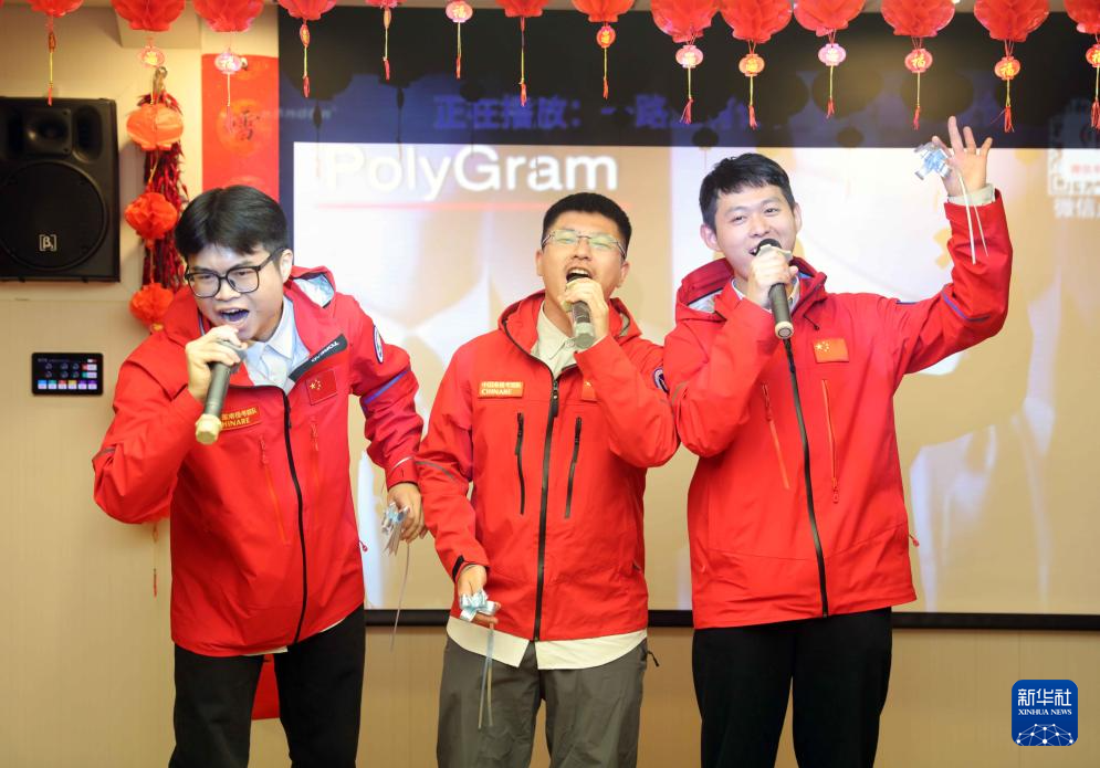 考察队员姚俊豪(左)、何靖(中)和黄文浩在“雪龙2”号春晚上表演(1月28日摄)。