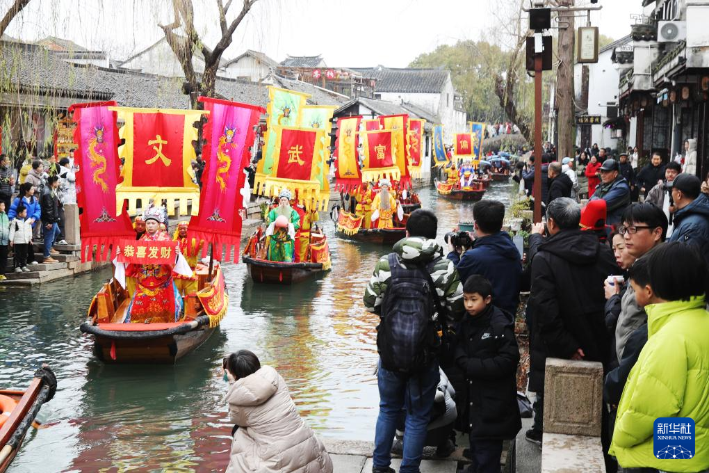 2月2日,“财神”在江苏省苏州市周庄古镇水上巡游,向沿街商家和游客送上祝福。