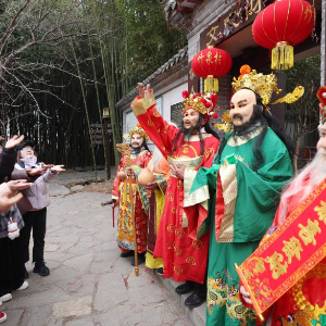 2月2日,“财神”在江苏省句容市宝华山国家森林公园为游客送祝福。