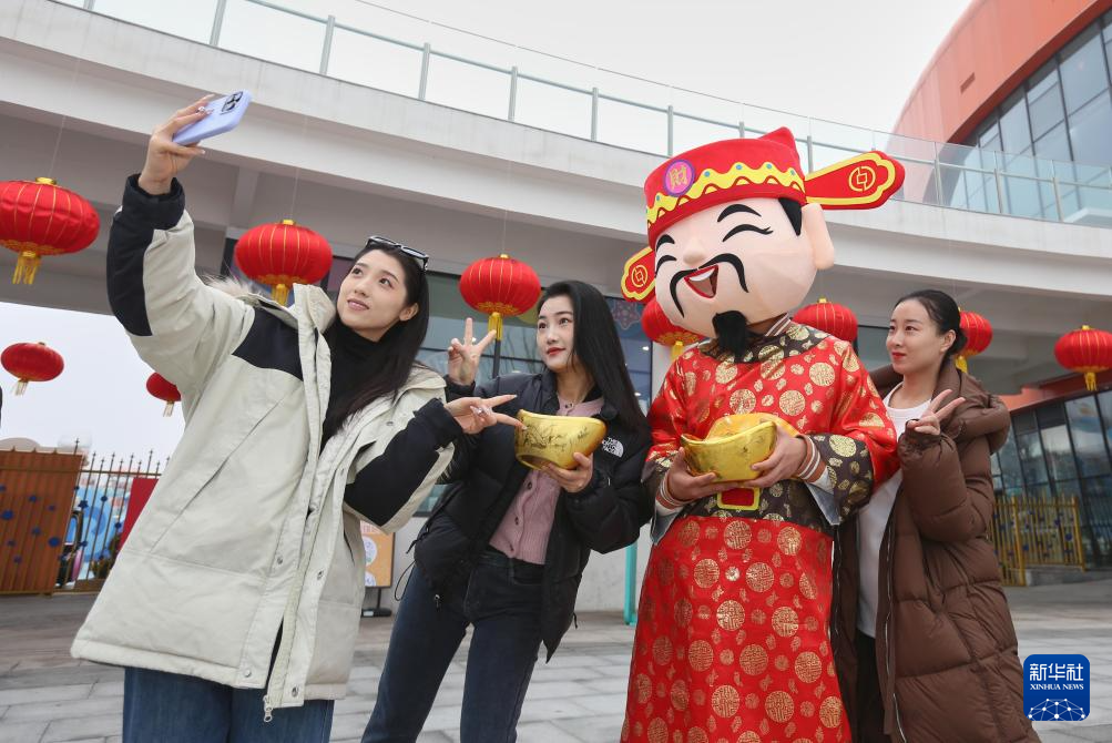 2月2日,游客在山东省滨州市季高兔窝窝·黄河梦乐园内举办的财神文化节上与“财神”互动。