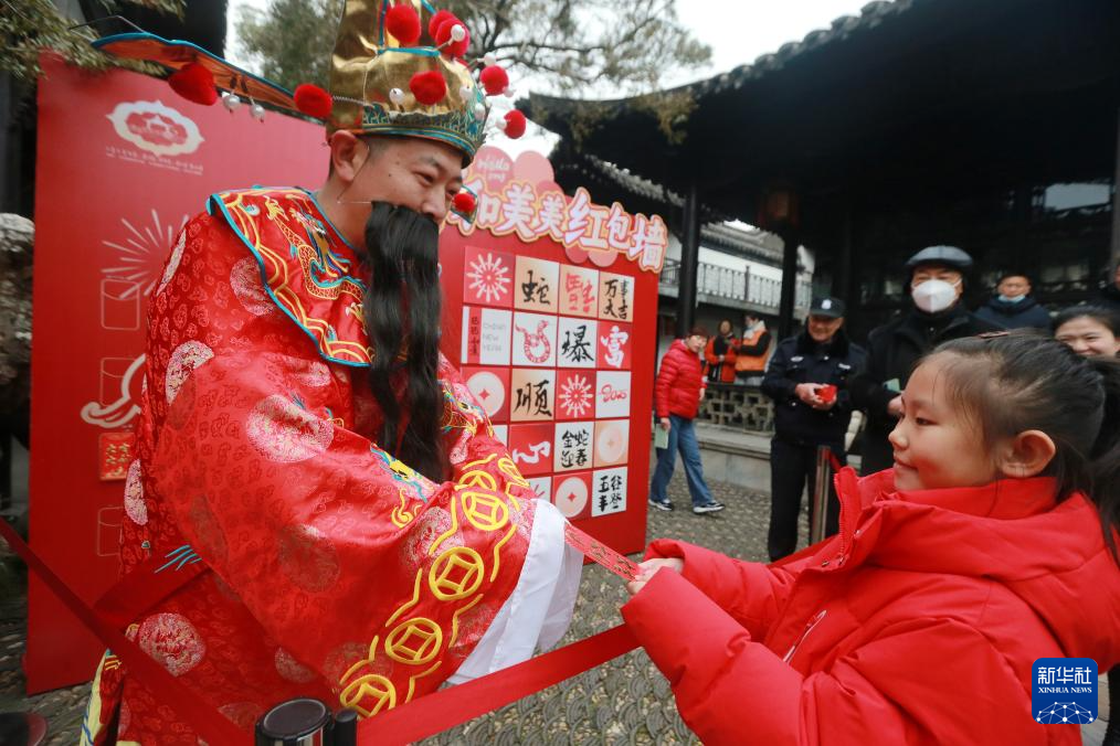 2月2日,“财神”在江苏省扬州市何园景区向游客派发红包。