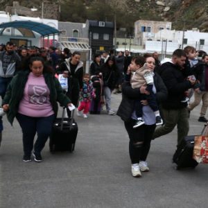 2月4日,民众在希腊圣托里尼岛轮渡码头准备乘坐船只撤离。
