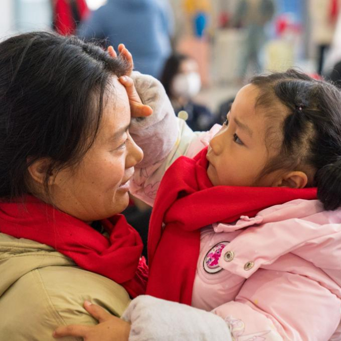 2月5日,乘客在广南县站外为孩子整理衣物。