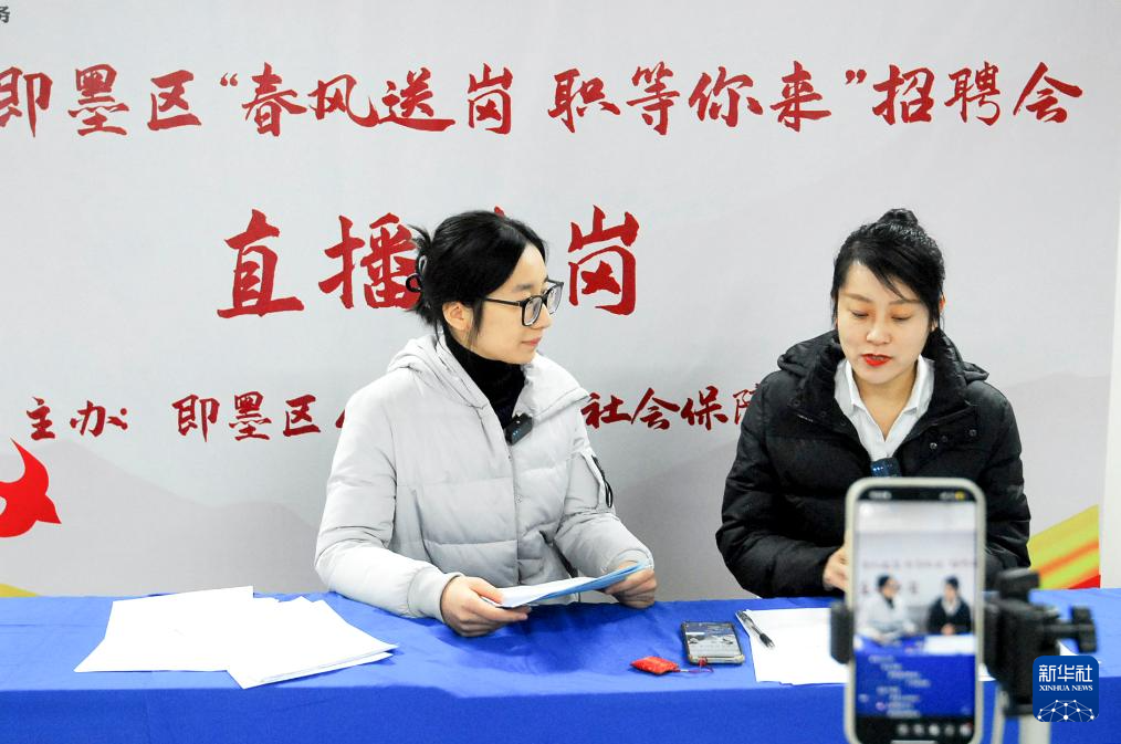 2月6日,在山东省青岛市即墨区专场招聘会现场,工作人员同步开展线上“直播带岗”。
