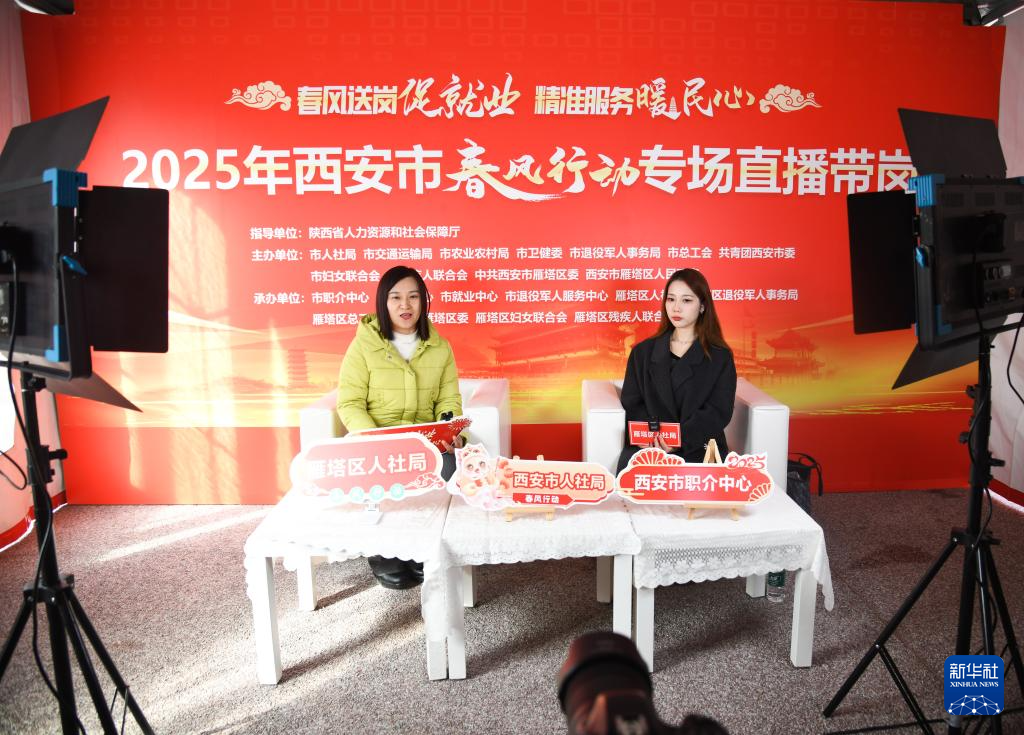 2月6日,在西安市“春风行动”专场招聘会现场,一家用人单位工作人员(左)进行“直播带岗”。