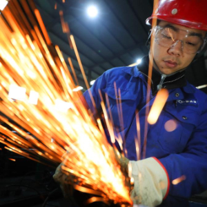 2月7日,在浙江省宁波市鄞州区东吴镇的日月重工厂区,工人打磨抛光风电设备部件。
