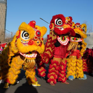 2月8日,在广饶县民俗巡游表演活动上,当地群众进行舞狮表演。