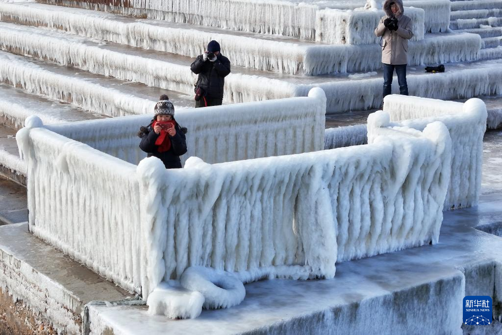 2月8日,游客在山东烟台海滨观赏和拍摄冰凌景观(无人机照片)。