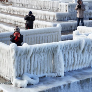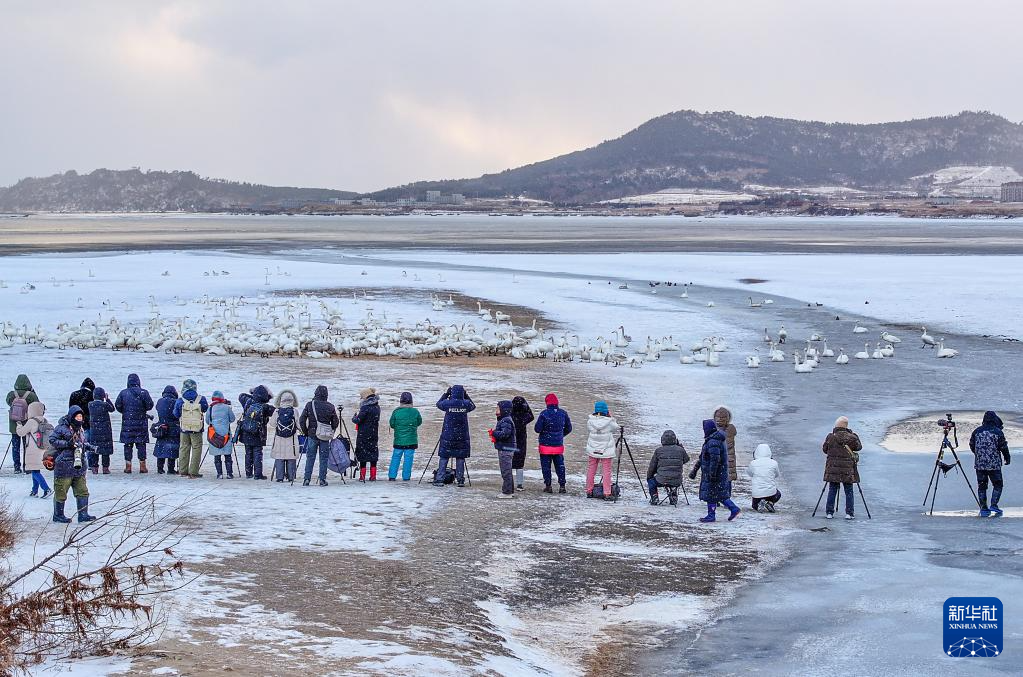2月8日,在山东省荣成市天鹅湖一处观景平台,摄影爱好者冒雪拍摄大天鹅。