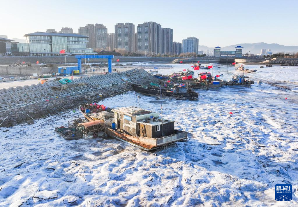 2月8日,在江苏连云港海州湾国家级海洋公园海岸边,渔船被冻在海岸边(无人机照片)。