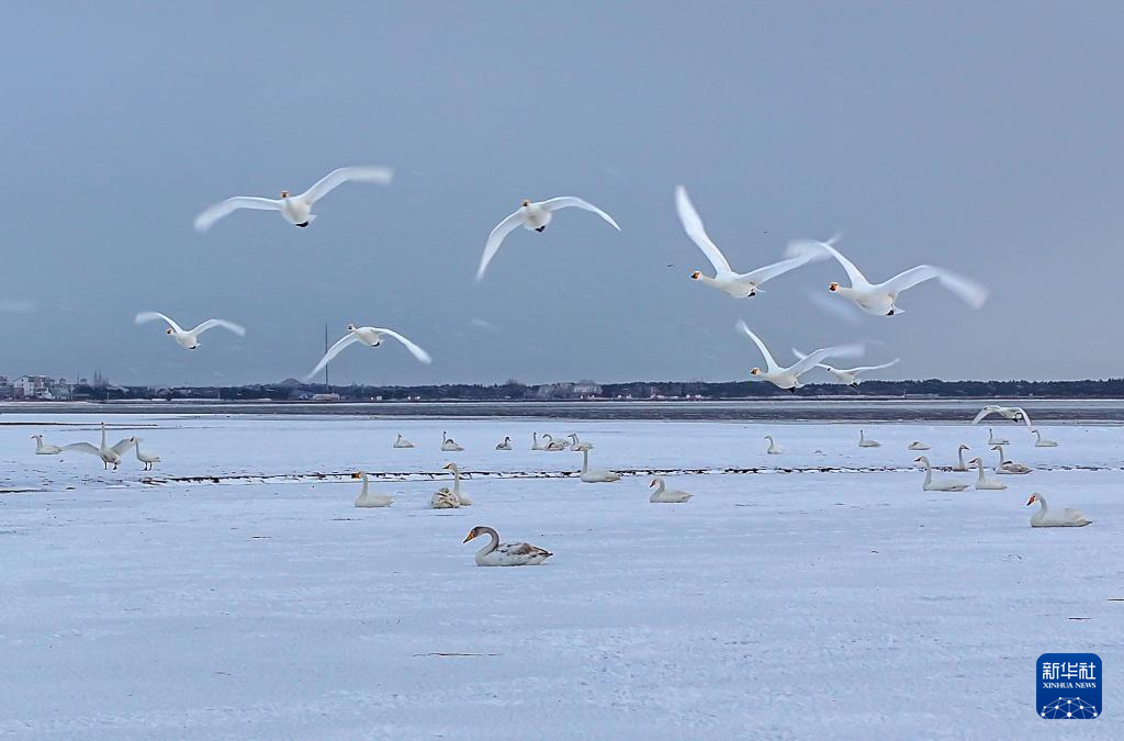 2月8日,在雪后的山东省荣成市成山天鹅湖,大天鹅在栖息、飞翔。