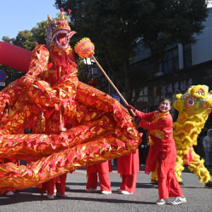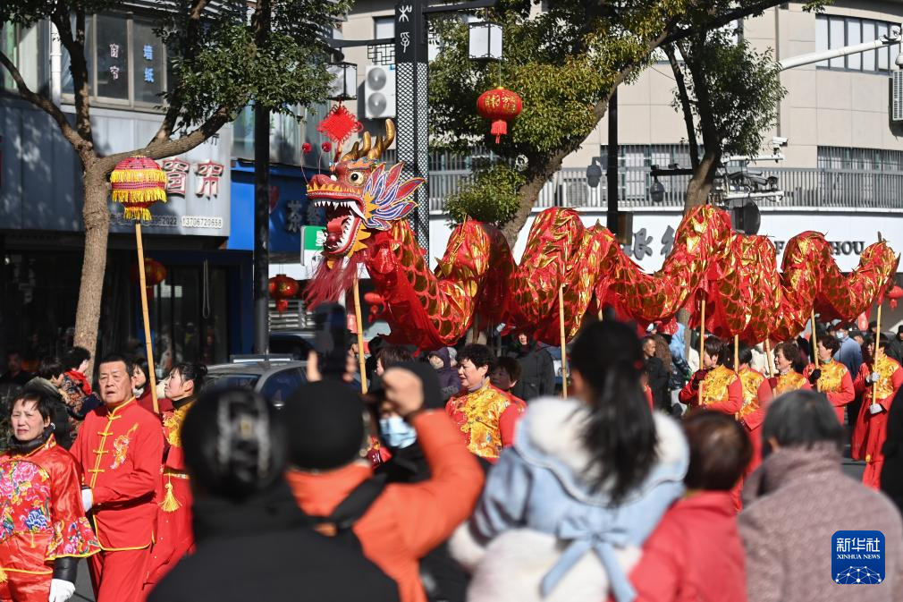 2月8日,舞龙队在南浔区和孚镇街区巡游。