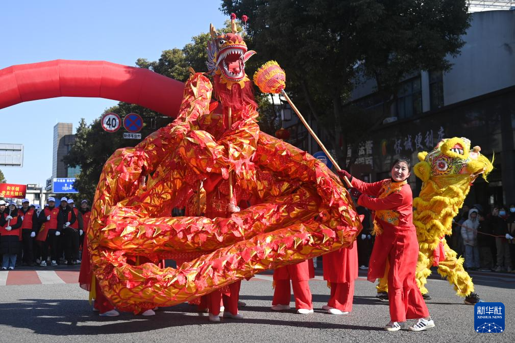 2月8日,乡村女子舞龙队在南浔区和孚镇街区表演。