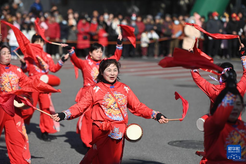 2月8日,乡村女子腰鼓队在南浔区和孚镇街区巡游表演。