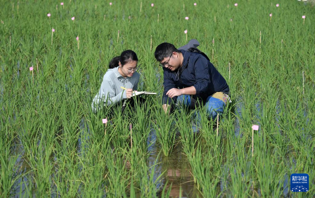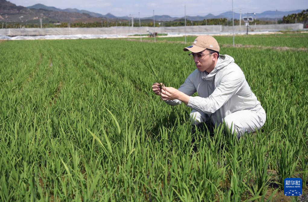 2月10日,在三亚市崖州湾科技城,南京农业大学三亚研究院科研人员在调查水稻农艺性状。