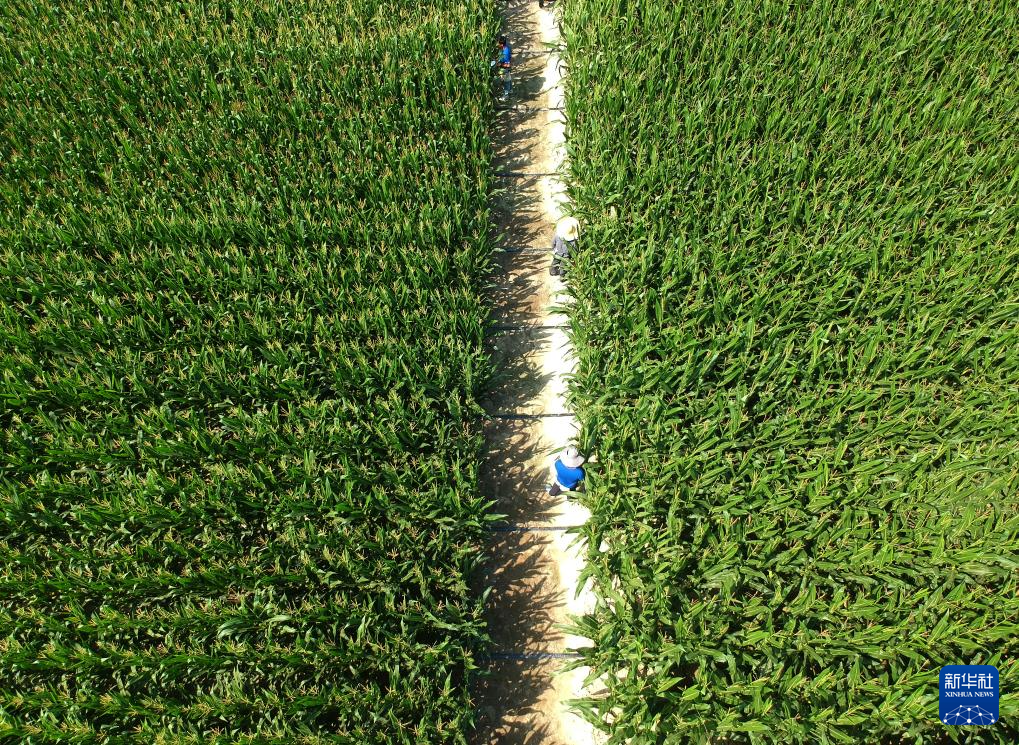 2月10日,在三亚市崖州湾科技城,隆平生物技术(海南)有限公司的科研人员在科研玉米地里工作(无人机照片)。