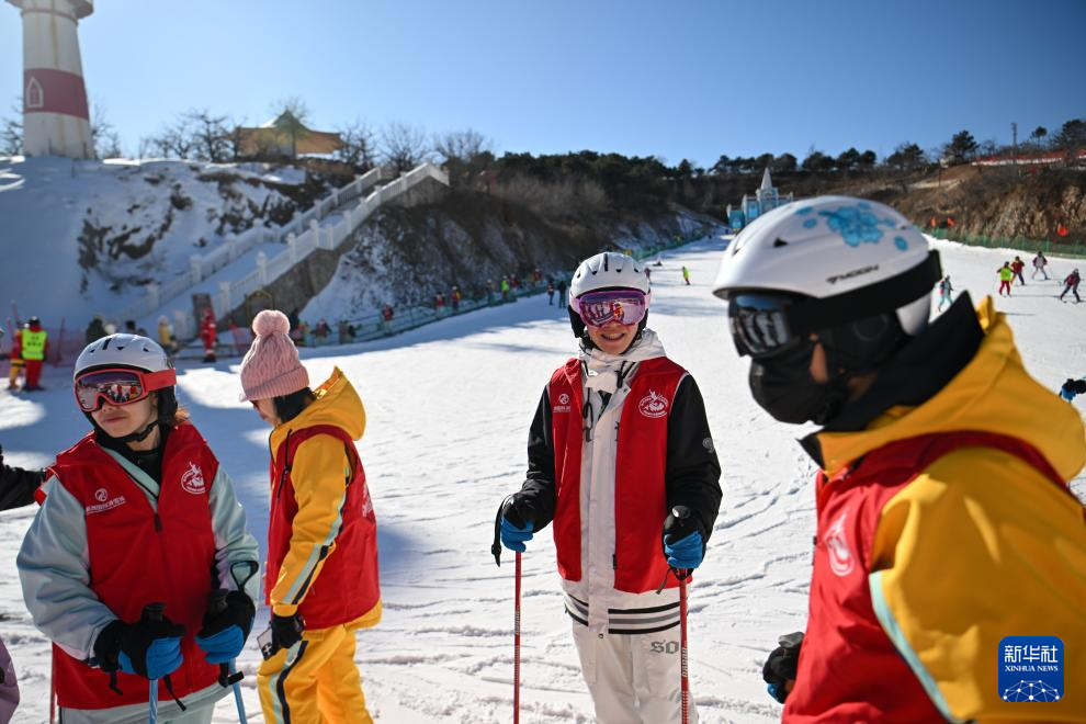2月10日,参加冰雪体验营的青年在天津市蓟州区的一处滑雪场合影。