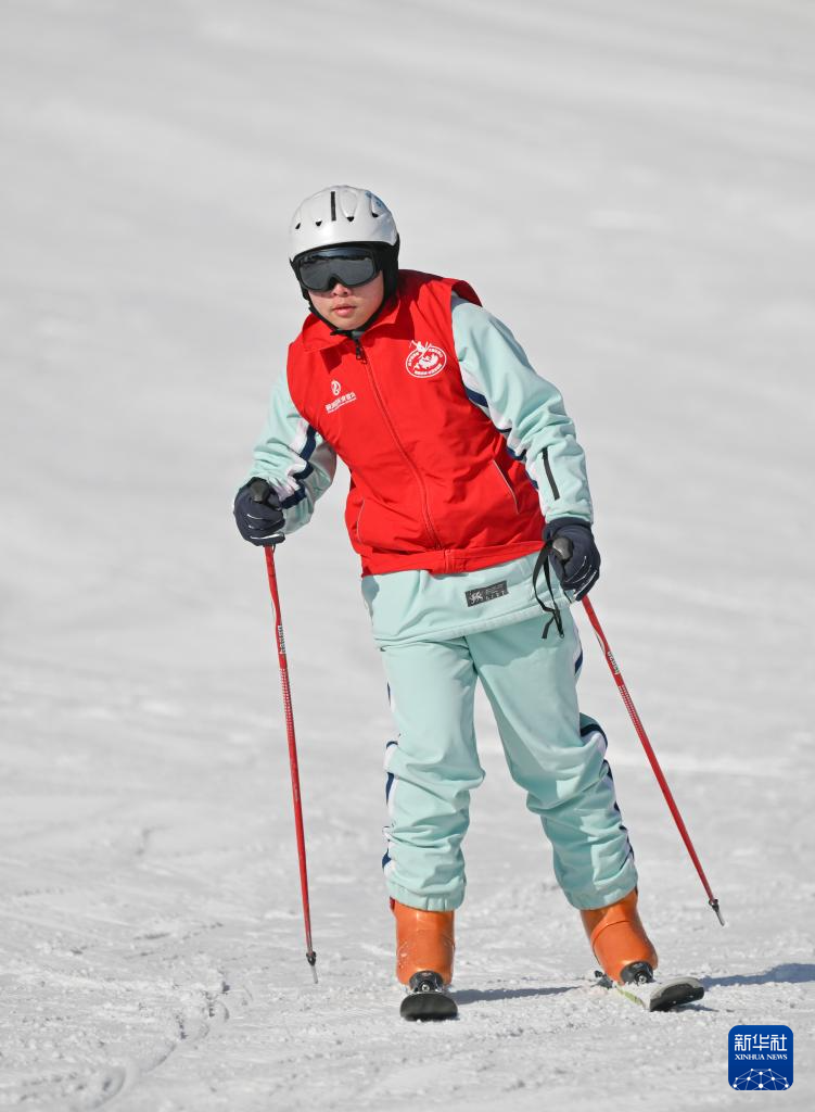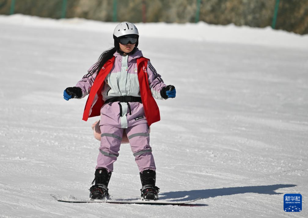 2月10日,台湾青年在天津市蓟州区的一处滑雪场练习滑雪。