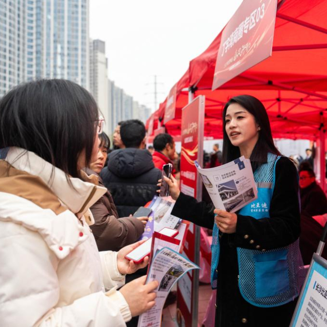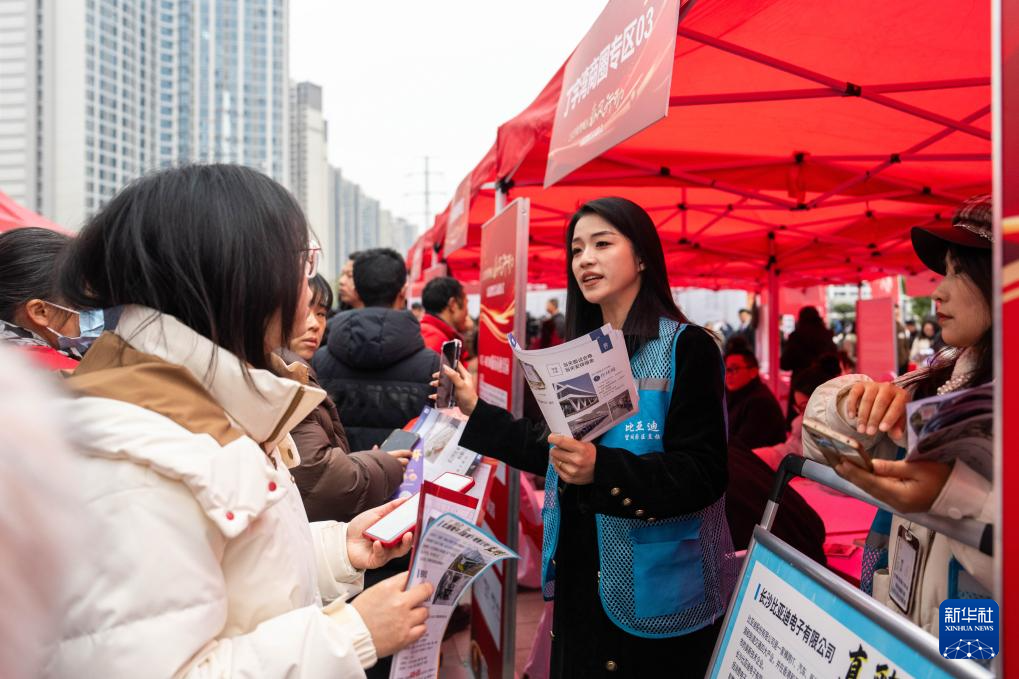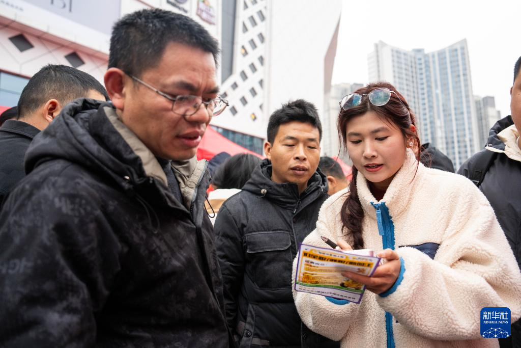 2月11日,在望城区龙湖月亮岛天街商场外坪,用人单位招聘人员(中)在介绍岗位信息。