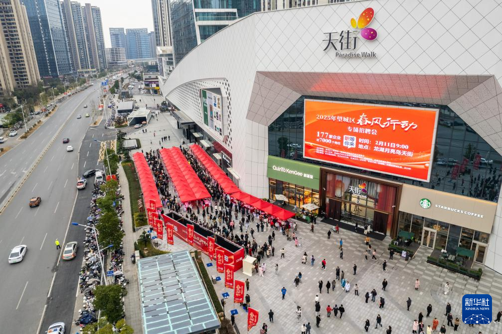 这是2月11日在望城区龙湖月亮岛天街商场外坪拍摄的招聘会现场(无人机照片)。