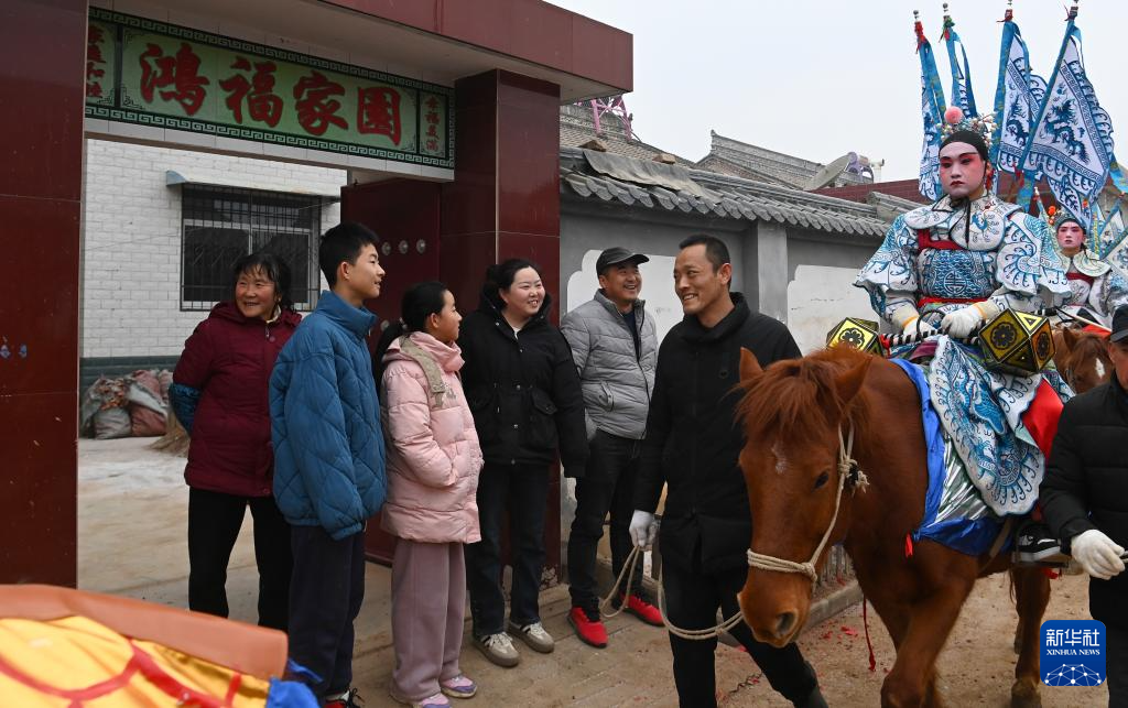 2月11日上午,黄花峪村村民在家门口欢迎社火队的到来。
