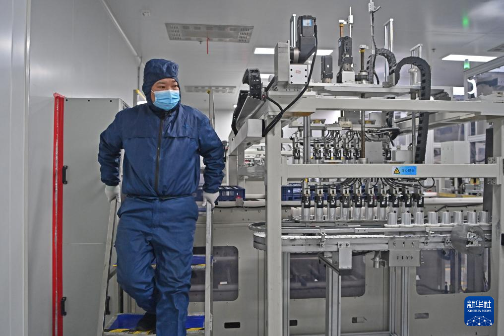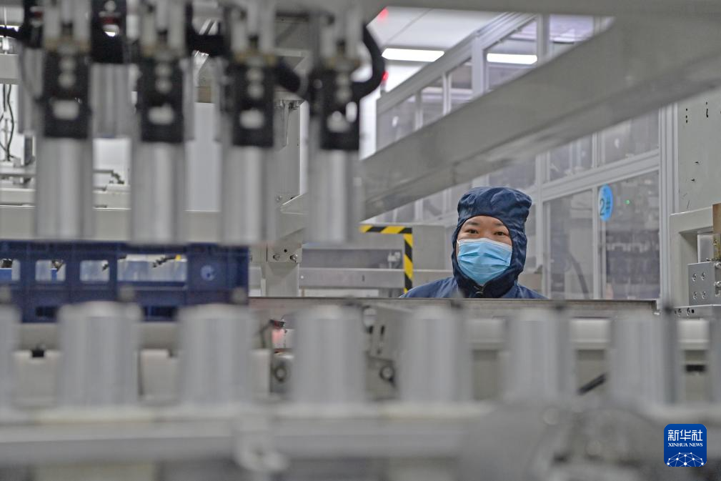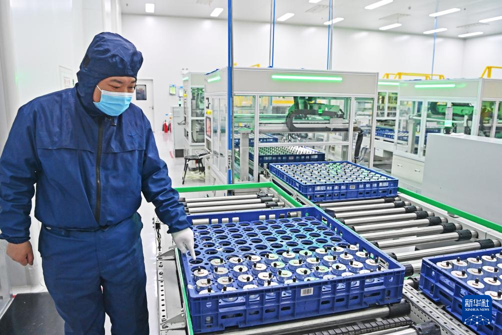 王东林(左)在车间查看电池生产状况(2月9日摄)。