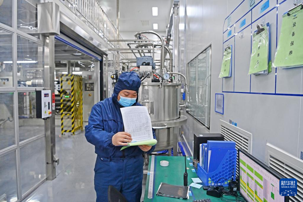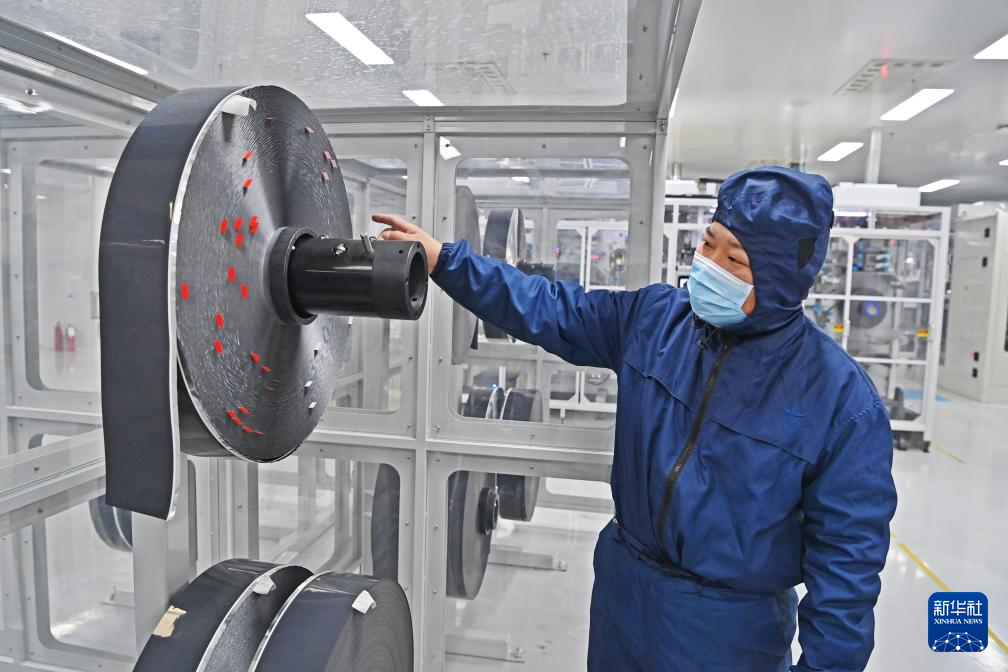王东林在查看一卷正极卷料的状况(2月9日摄)。