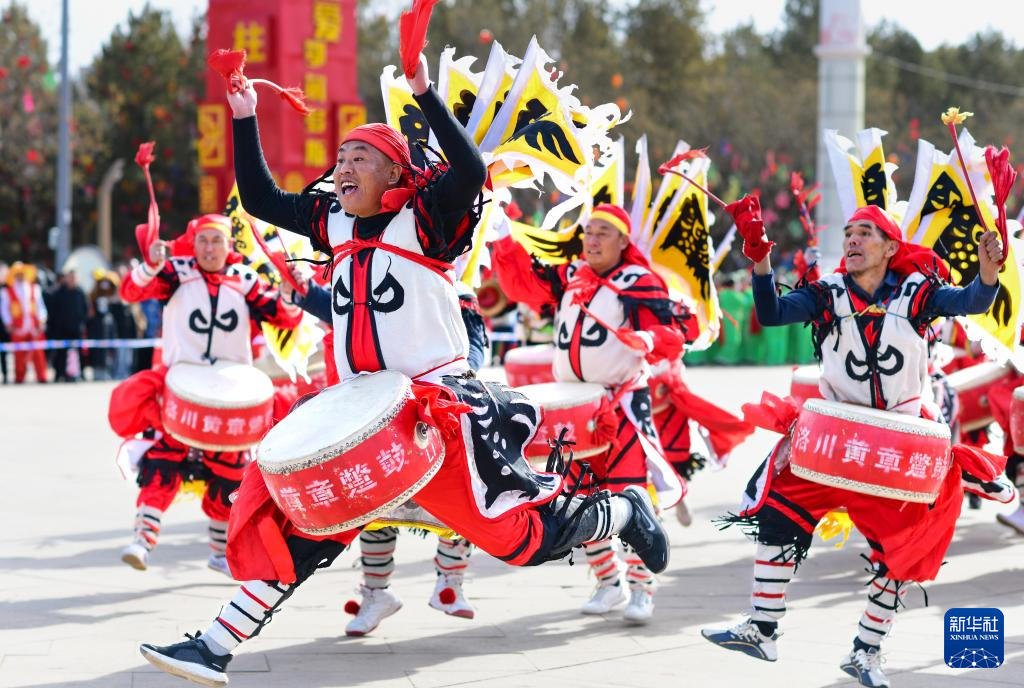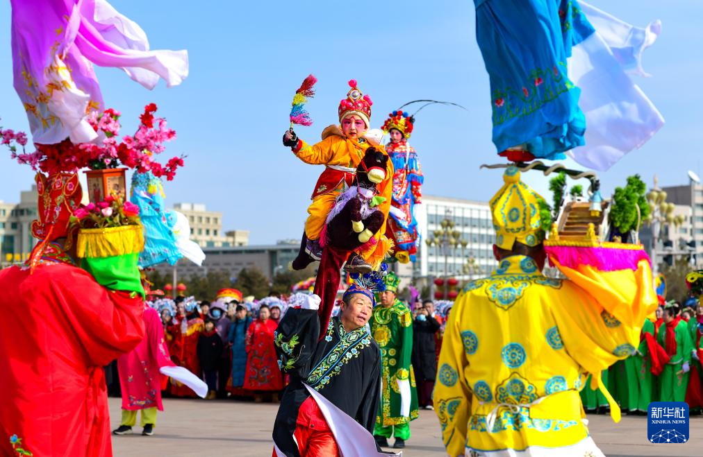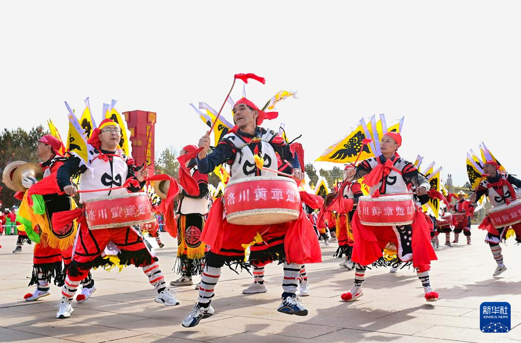 2月11日,民间艺人在鄂尔多斯市康巴什区秧歌大拜年活动中表演洛川蹩鼓。洛川蹩鼓于2006年入选国家级非物质文化遗产名录。