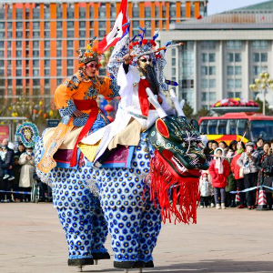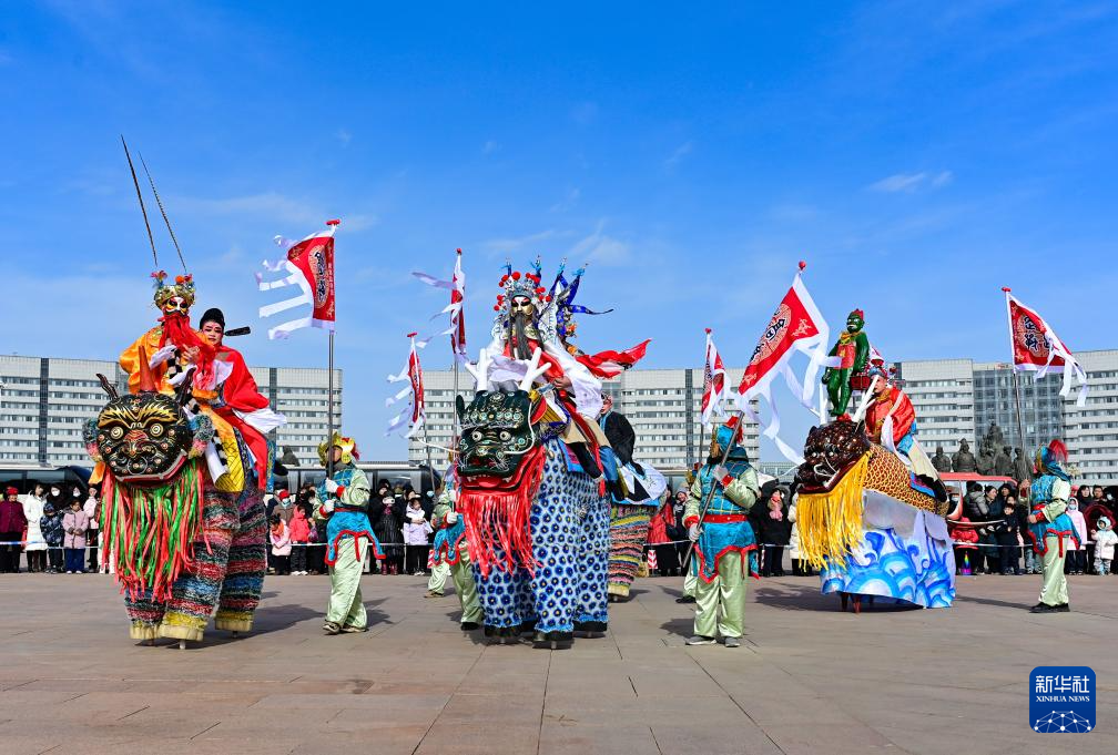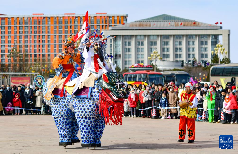 2月11日,民间艺人在鄂尔多斯市康巴什区秧歌大拜年活动中表演高跷走兽。高跷走兽于2006年入选国家级非物质文化遗产名录。