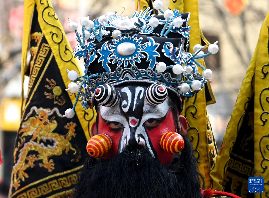 2月12日,步社火演员在陇县元宵节社火巡游活动上表演。