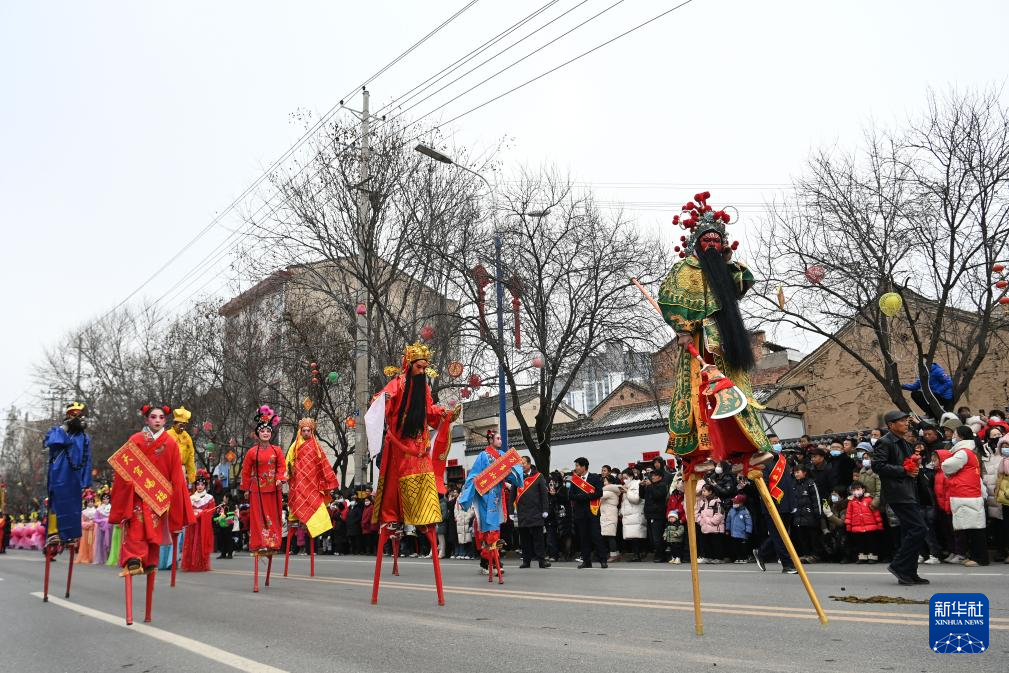 2月12日,高跷社火演员在陇县元宵节社火巡游活动上表演。