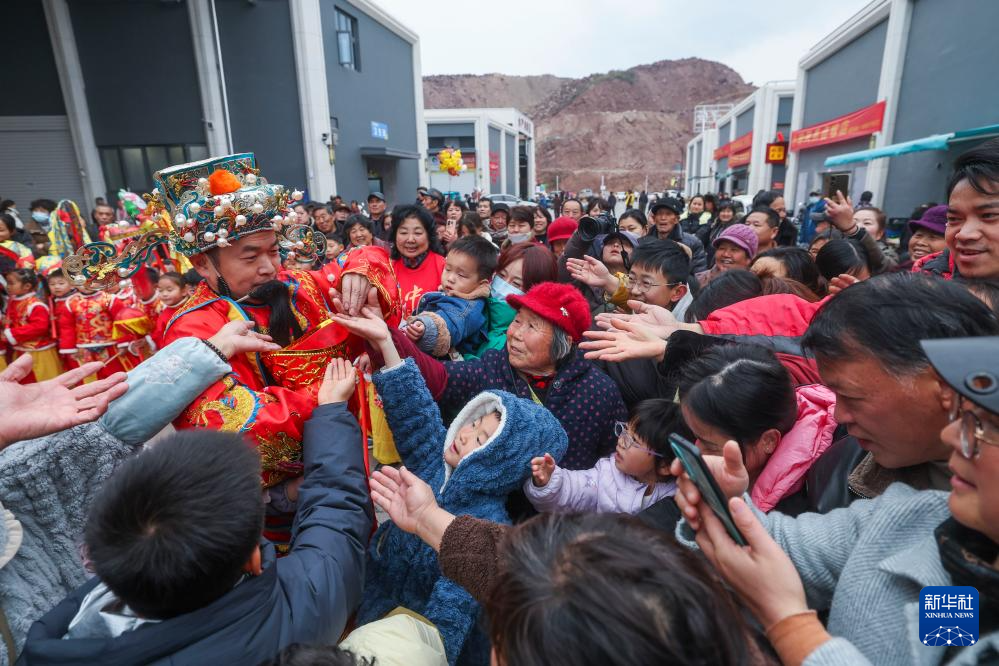 2月12日,在建德市更楼街道的建德新农都农产品批发市场元宵市集上,人们参与“财神送福”活动。